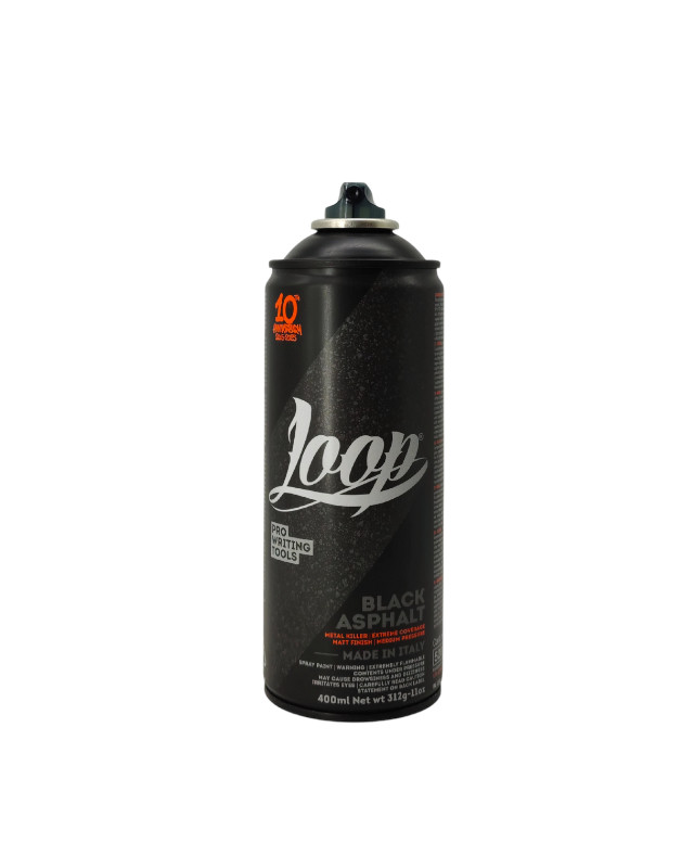 Loop Colors Asphalt - Silver Killer kaavan avulla valmistettu peittävä mattamusta spraymaali. Pehmeän venttiilin ansiosta purkilla pystyy tuottamaan niin ohutta kuin paksua jälkeä.
